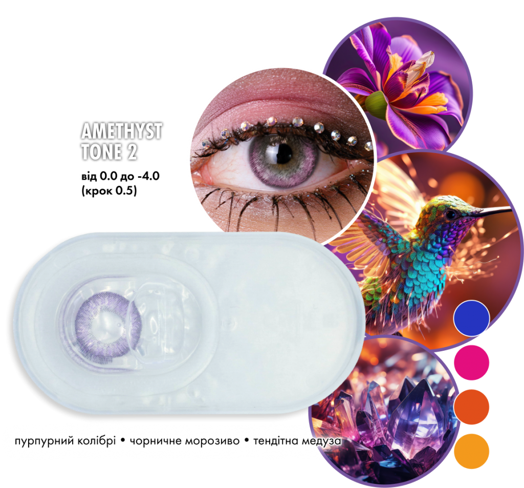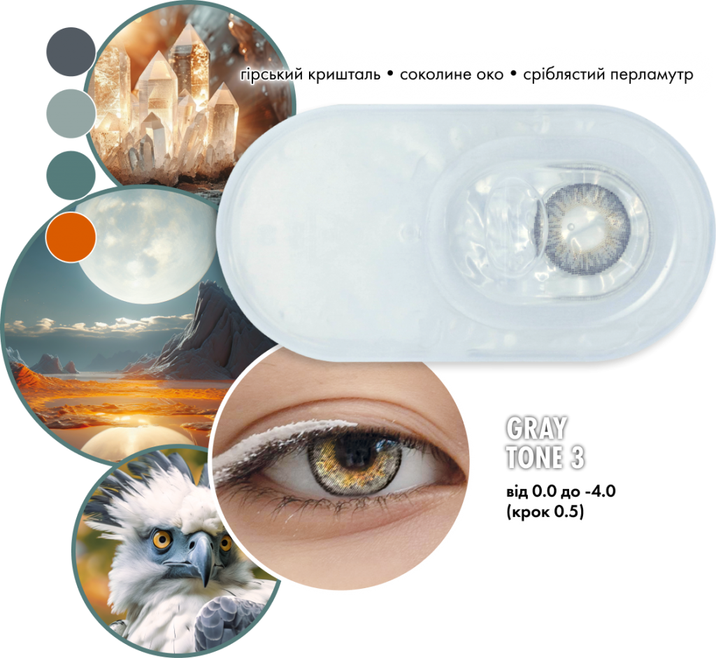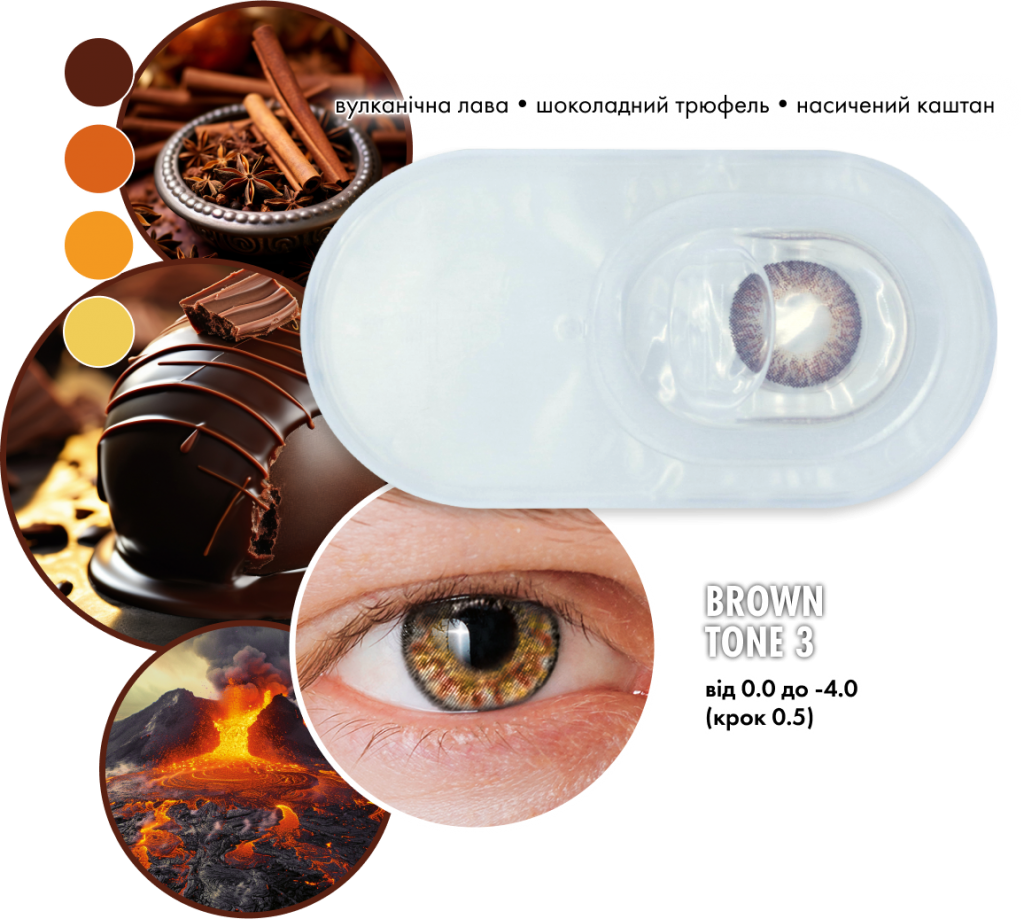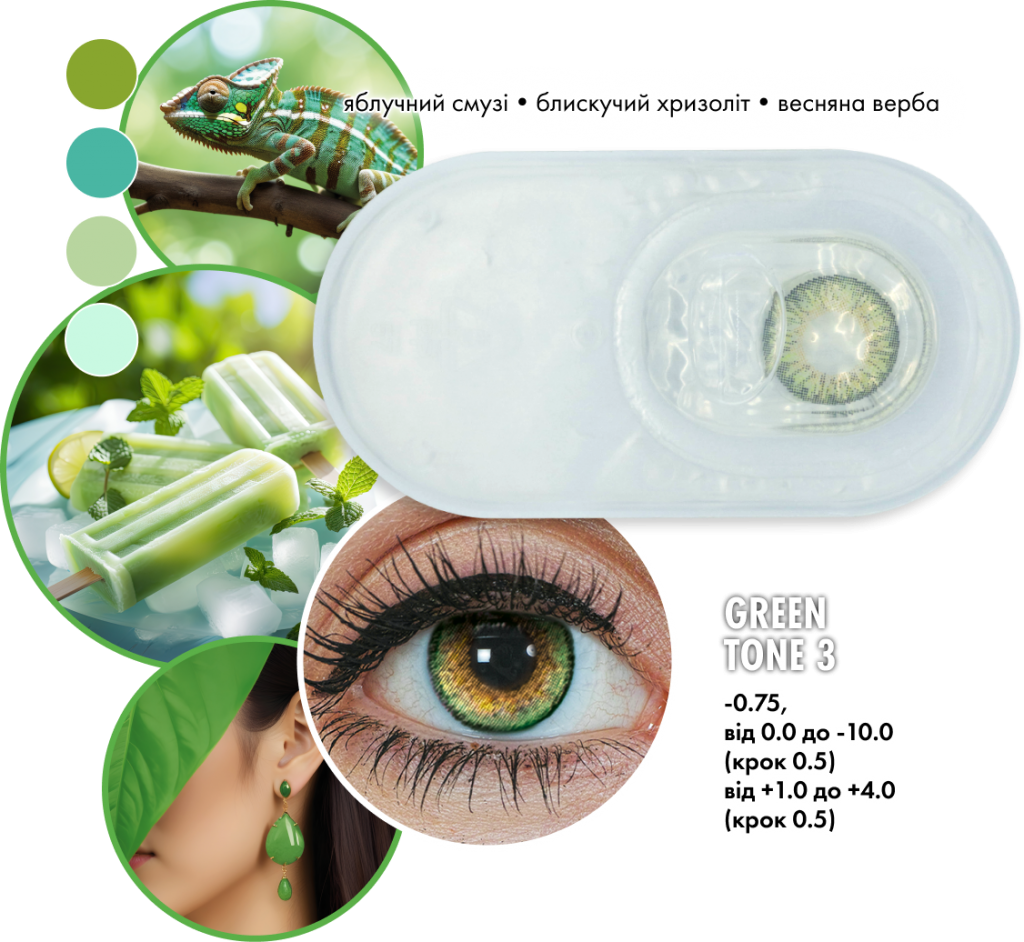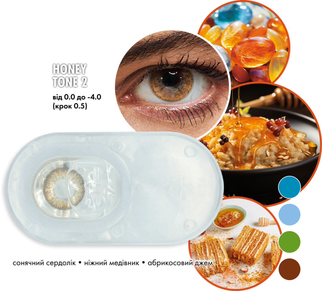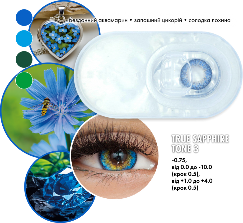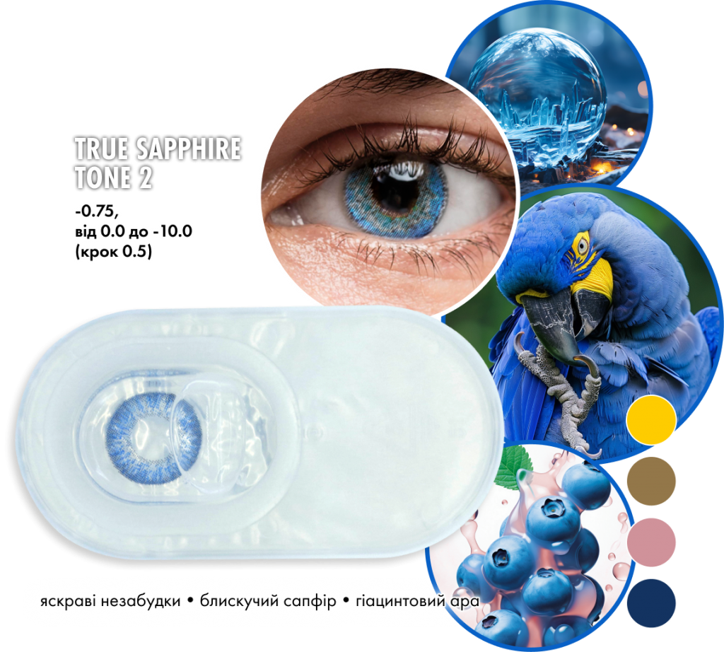 -0,75 - True Sapphire, Green, Turquoise від 0 до -4.0 (крок 0.5) - Gray, Brown, Amethyst, Honey від +1.0 до +4.0 (крок 0.5) - True Sapphire
