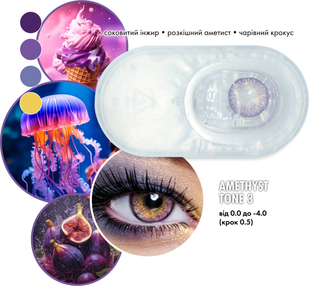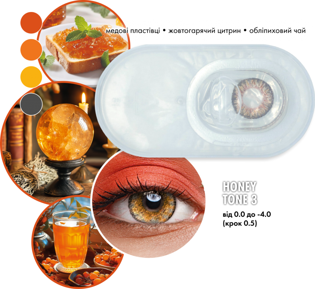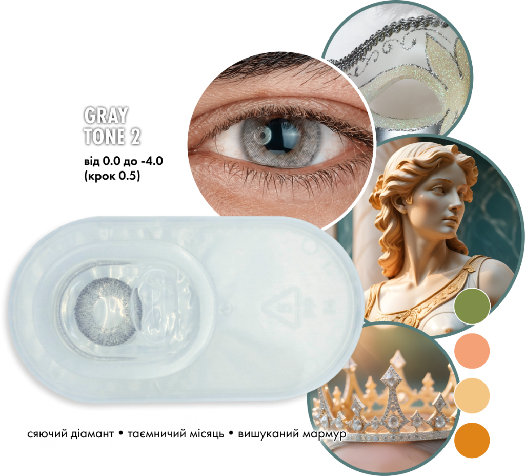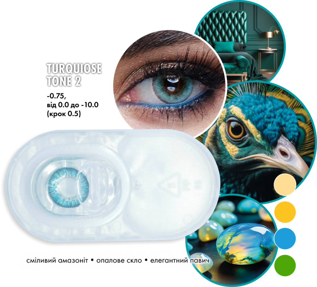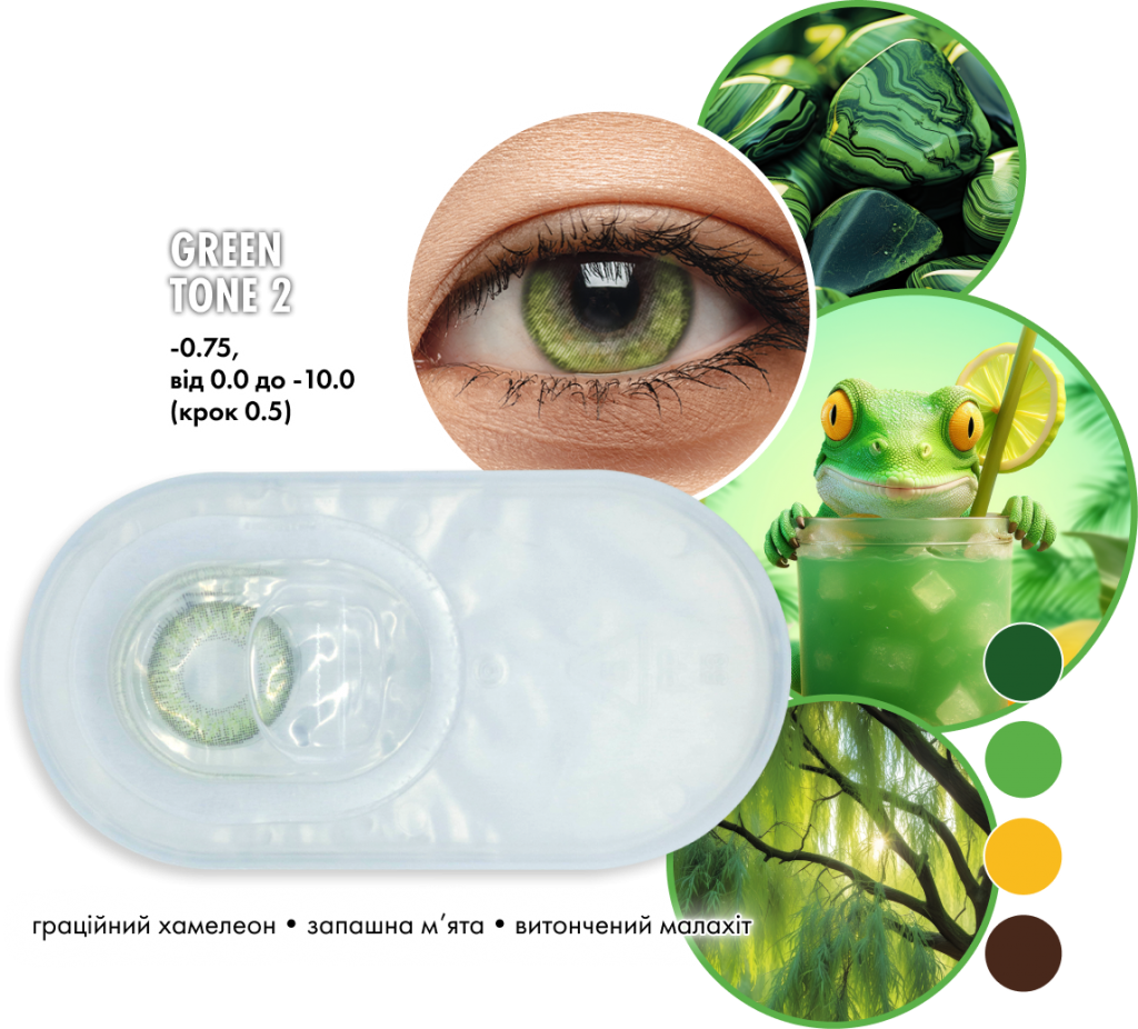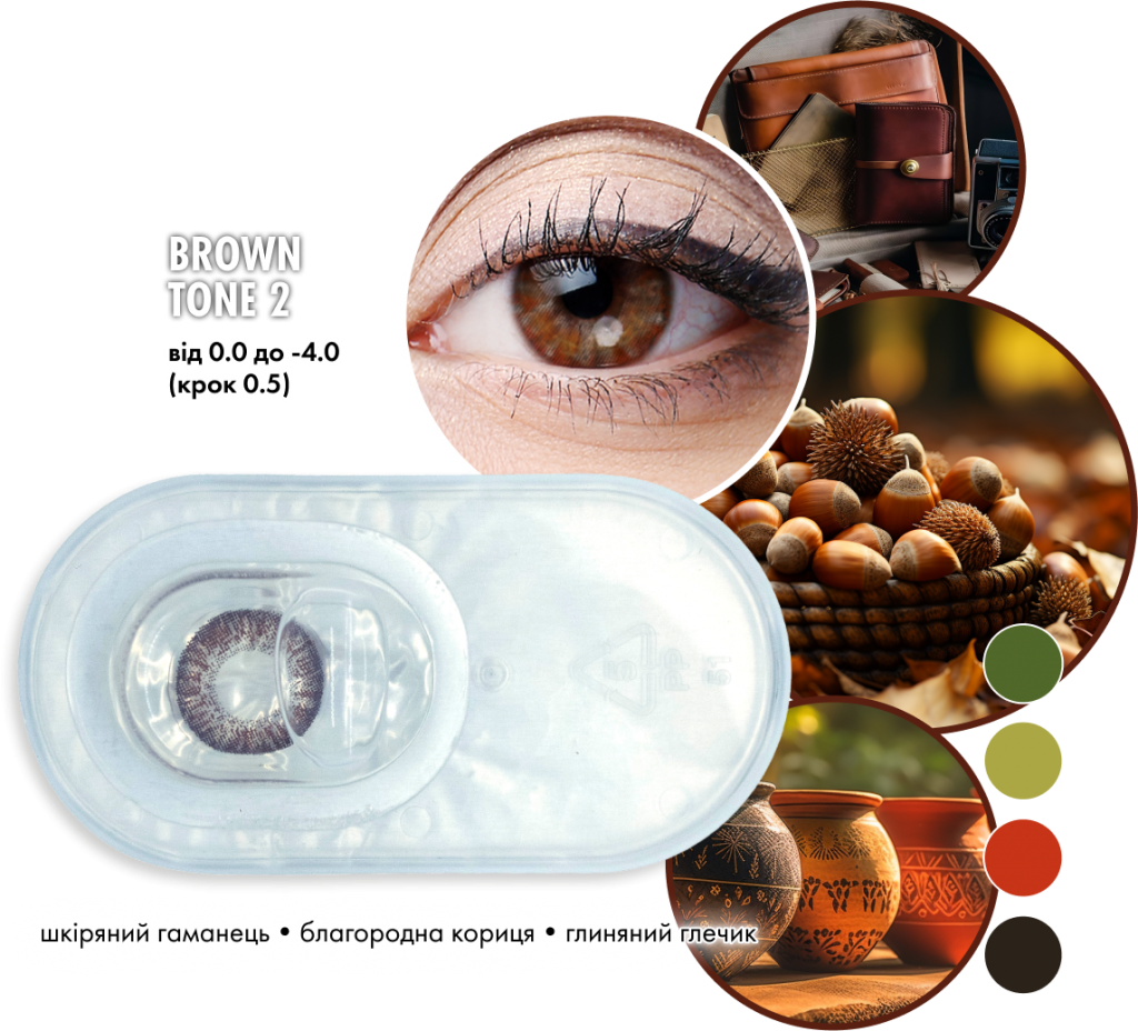 -0,75 - True Sapphire, Green, Turquoise від 0 до -4.0 (крок 0.5) - Gray, Brown, Amethyst, Honey від +1.0 до +4.0 (крок 0.5) - True Sapphire